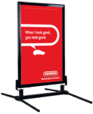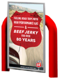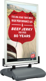 MDI offers four products to use in the fuel island area. Use standard 28" x 44" PosterGrip® frames (MDI part number 825SA) combined with the Horseshoe Bollard Bracket Kit to permanently mount frames in the fuel island area. No bollards? Then use either the original WindMaster® curb sign or the Rolling Base WindMaster®.
